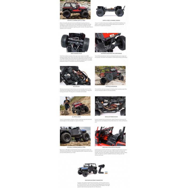 Sebbene la Jeep SCX10 III CJ-7 sia progettata e attrezzata per affrontare qualsiasi sentiero, è proprio l'incredibile dettaglio delle dimensioni che farà impaziare i fan di Axial di farla diventare la tela per il loro prossimo capolavoro di arrampicata sulle rocce. Oltre alla carrozzeria ufficialmente autorizzata Jeep CJ-7, questo impianto presenta paraurti e blindatura corporea Gen-Right ufficialmente autorizzati, un interno completo con console centrale apribile, una gabbia di sicurezza e altro ancora. Anche le ruote e le gomme ne aumentano l'autenticità. Le ruote sono con licenza ufficiale Raceline Daytona a blocco, mentre le gomme ad alta aderenza sono battistrada ufficialmente autorizzate Micky Thompson Baja Boss.
