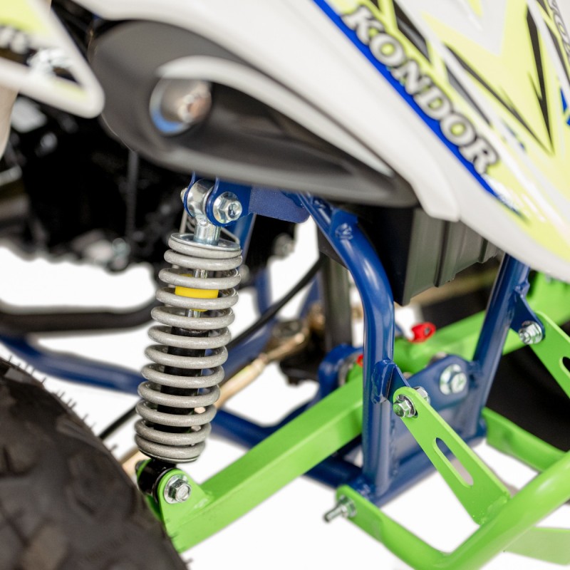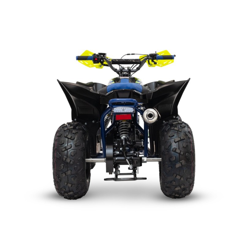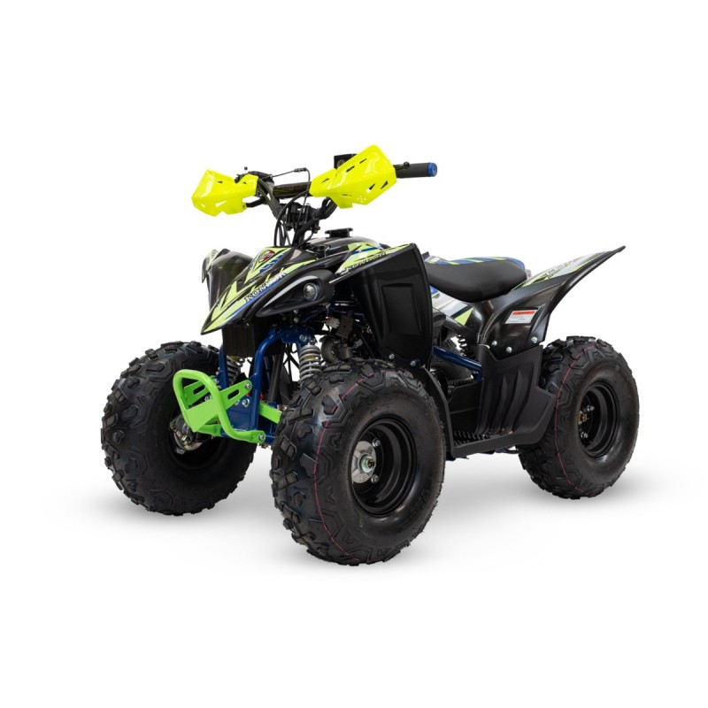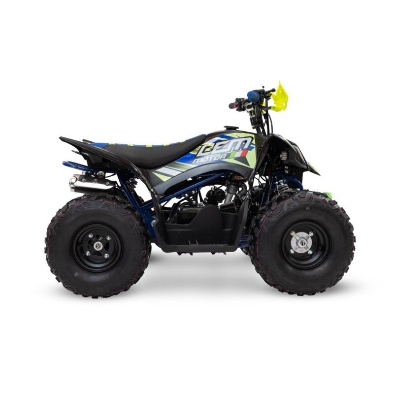 Il nostro quad è dotato di un motore 4 tempi monocilindrico con retromarcia da 110cc, alimentato tramite carburatore con serbatoio da 3,5 litri per benzina verde. Dispone di accensione CDI, avviamento elettrico e cambio automatico, con trasmissione a catena. Le dimensioni del quad sono di 125x74x66 cm (altezza sella), con un peso medio di 75 kg. Monta cerchi in alluminio e pneumatici 16/8-7 sia all'anteriore che al posteriore. È equipaggiato con freno anteriore e posteriore a disco idraulico per una guida sicura e confortevole.