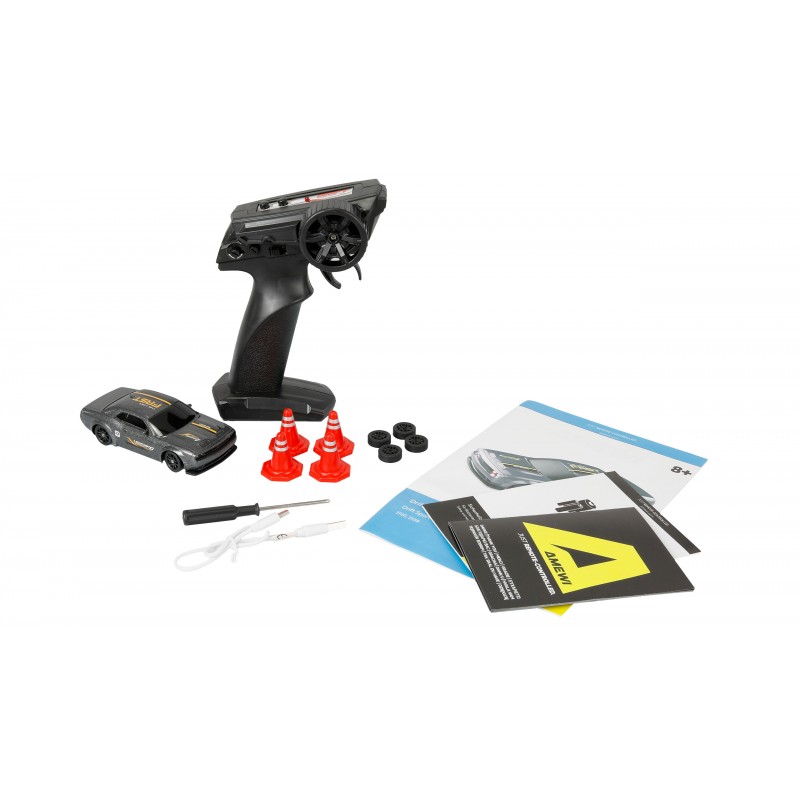 Lo sterzo può essere regolato con precisione sul telecomando. Per un piacere di guida vario, sono inclusi sia pneumatici da drift in plastica che pneumatici da strada con rivestimenti in gomma. Con i piloni chiusi, è possibile impostare le proprie piste o percorsi di deriva. Come set RTR (Ready-to-Run), la Drift Sport Muscle Car è completamente pronta per la guida e contiene tutto il necessario per iniziare immediatamente, ideale per i piccoli piloti che vogliono provare un grande divertimento di guida in un pratico formato.