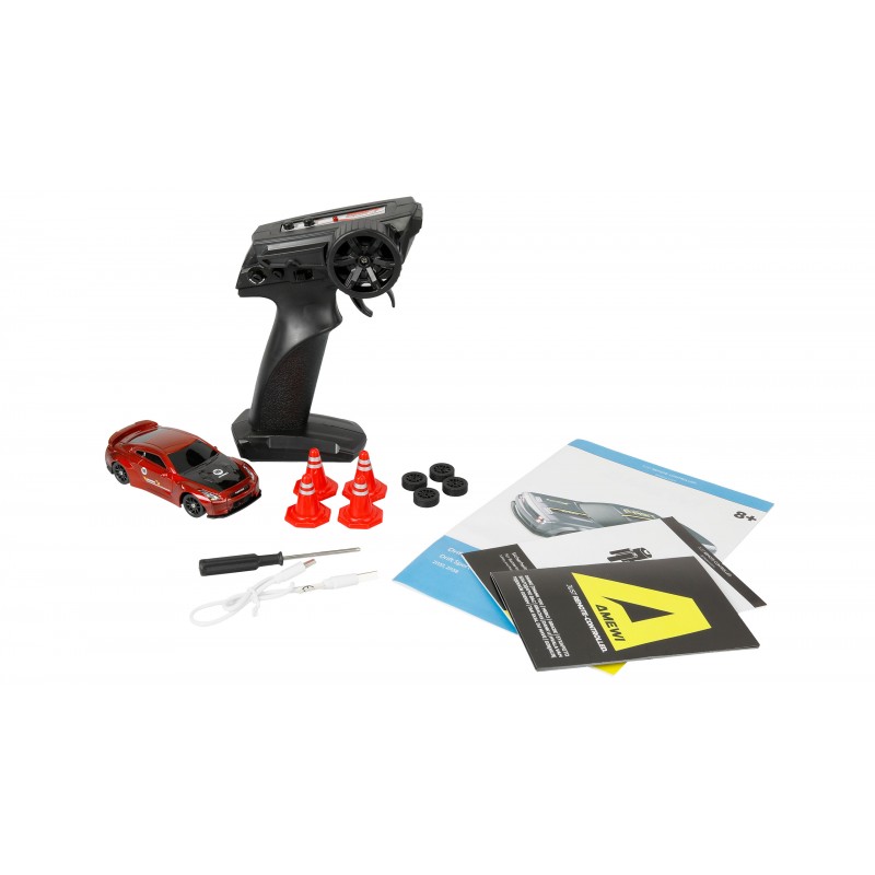 Altre caratteristiche: Set RTR (Ready-to-Run) con telecomando, batteria integrata e cavo di ricarica Sistema a 2,4 GHz a prova di interferenze Illuminazione a LED commutabile (sottoscocca) Illuminazione a LED fissa anteriore/posteriore (sempre illuminata) Trim dello sterzo sul telecomando Batteria LiPo integrata da 150 mAh 3,7 V per tempi di guida fino a 20 minuti Presa di ricarica USB-C integrata per la ricarica rapida del modello (circa 30 minuti di ricarica) Velocità massima di circa 15 km/h Pneumatici da drift (plastica) e pneumatici da strada (gomma) inclusi Piloni inclusi per impostare una rotta di drift o simile Cavo di ricarica da USB-A a USB-C incluso Avviso di sottotensione sul veicolo per proteggere la batteria Servosterzo Micro 2g installato