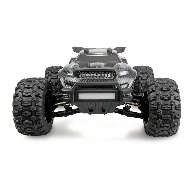 Il set RTR è completamente pronto all'uso e include telecomando, batteria e cavo di ricarica. Una scatola del ricevitore resistente all'acqua permette di utilizzarlo in quasi tutte le condizioni meteorologiche, mentre le gomme in gomma aderenti e gli alberi di trasmissione CVD in metallo anteriori e posteriori garantiscono la massima trazione e resistenza. Il telaio è progettato in una struttura a nido d'ape leggera e stabile ed è inoltre rinforzato da un solido montante metallico, che aumenta significativamente la rigidità torsionale.